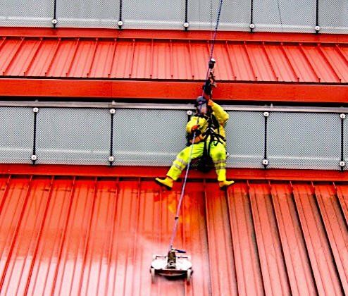 Unser Vorteil für die Reinigung am und auf Gebäuden besteht im Bedarfsfall unter anderem in der Nutzung modernster Krantechnik. Durch das Arbeiten vom Seil oder Befahrkorb aus erreichen wir unseren Arbeitsort ohne Leitern und Gerüste und z.B. ohne die Notwendigkeit, auf dem Dach zu laufen. Das ist weitaus kostengünstiger und vermeidet sonst häufig auftretende Schäden.